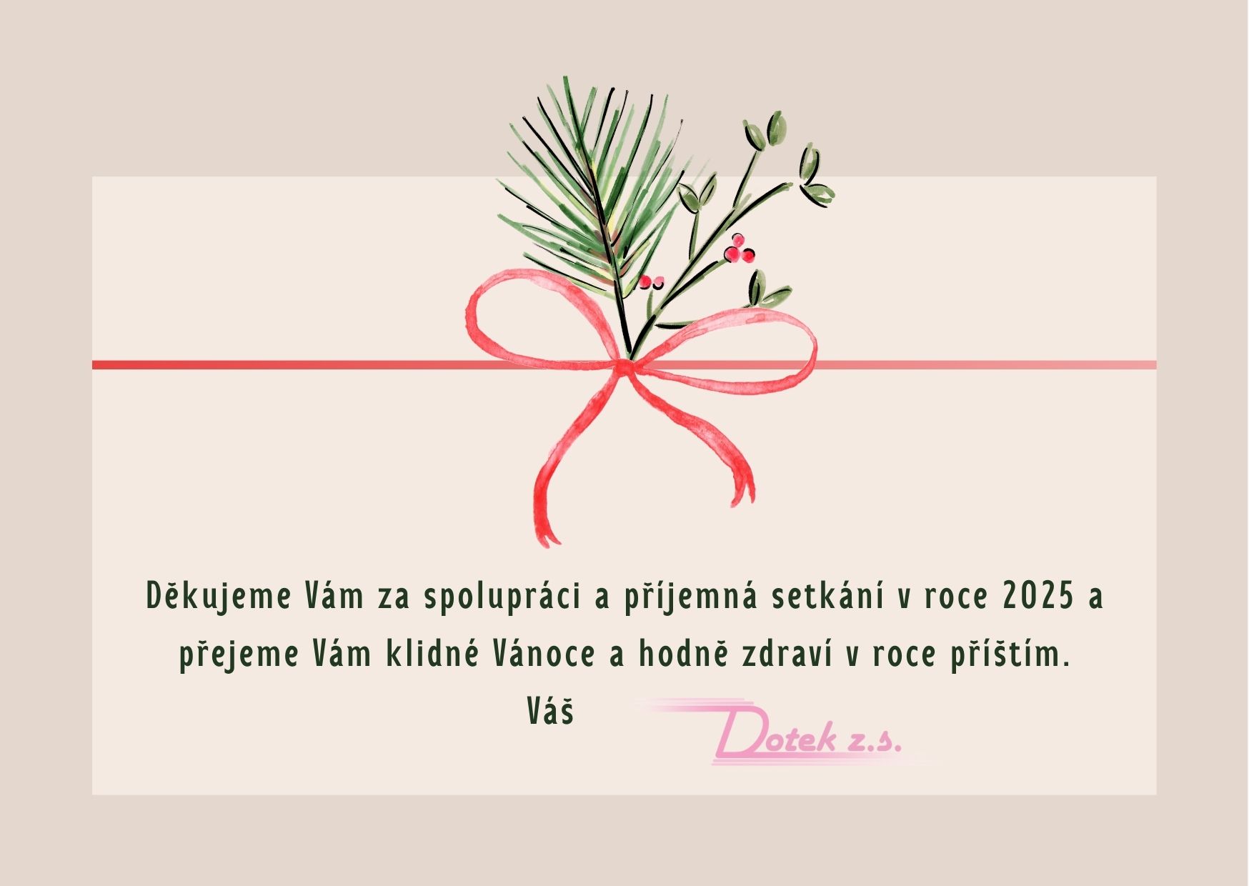 Děkujeme za spolupráci a podporu v roce 2021, přejeme Vám radostné a klidné prožití vánočních svátků, hlavně ve zdraví a těšíme se na setkání v roce 2022. DOTEK z.s.